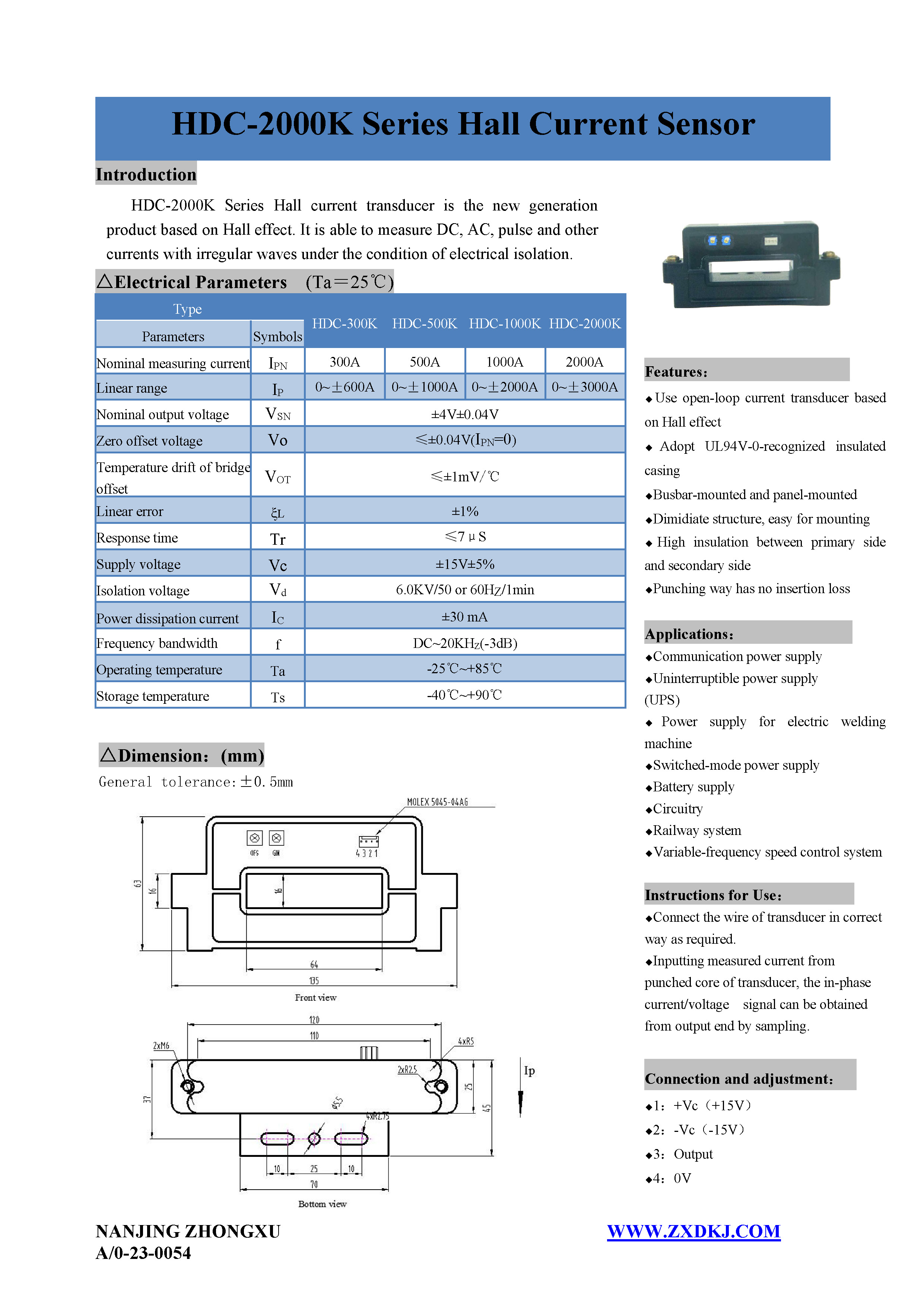 HDC-2000K series Hall current sensor is a new generation of current sensor using the principle of Hall effect. It can measure currents of DC, AC, pulse and various irregular waveform under electrical isolation.