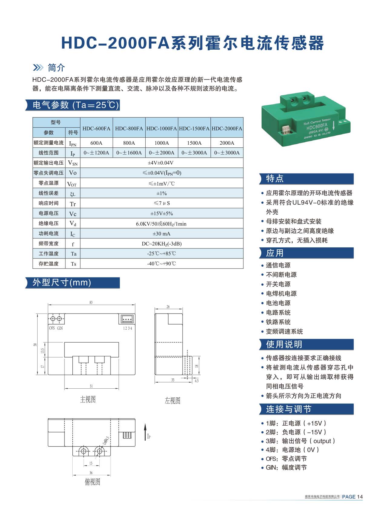 HDC-600FA series Hall current sensor is a new generation of current sensor using the principle of Hall effect. It can measure currents of DC, AC, pulse and various irregular waveform under electrical isolation.